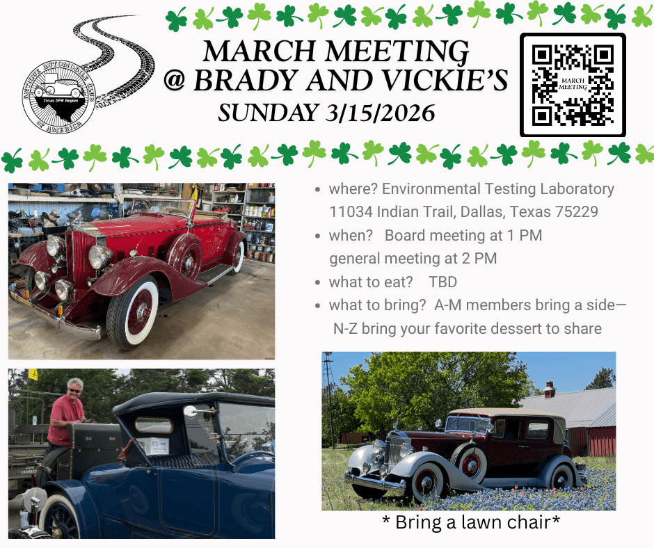 Where: Kip Motor Company, 2127 Crown Rd, Dallas, TX 75229, (972) 243-0440 When: Sunday the 18th Board Meeting 1 p.m. General Meeting 2 p.m.