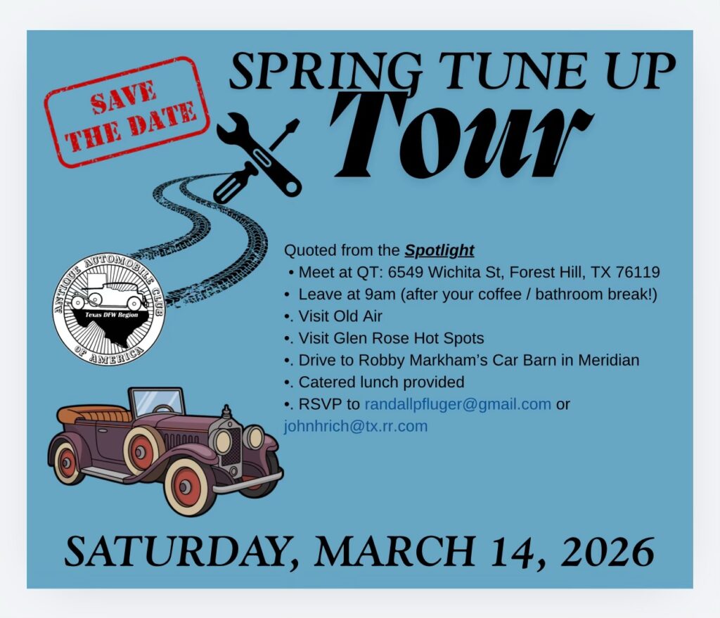 The AACA Texas DFW Region invites you to join us for our Spring Tune-up Tour! Whether you’re a long-time club member, invited guests, or someone who discovered us through our website, you are very welcome to join us on this tour.